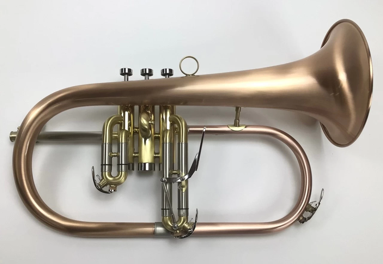 Dillon Opus Bb flugelhorn in brushed lacquer finish. Features include a red brass bell, .433″ bore, and small morse (Bach) taper leadpipe.