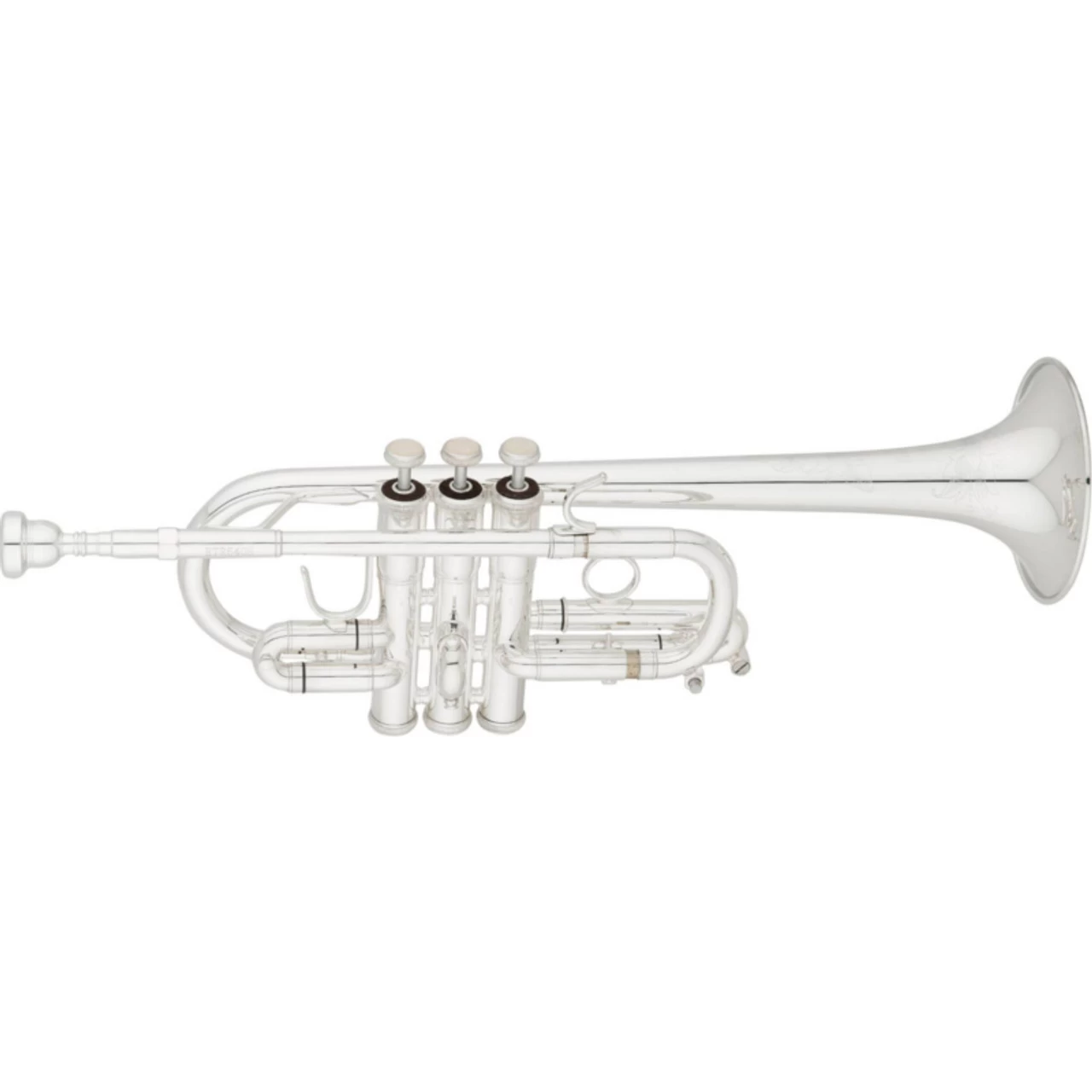 Key of Eb/D, .468” large bore, Handspun, engraved, yellow brass bell , Soldered, wire-reinforced rim, Silver-plated, Mouthpiece and case