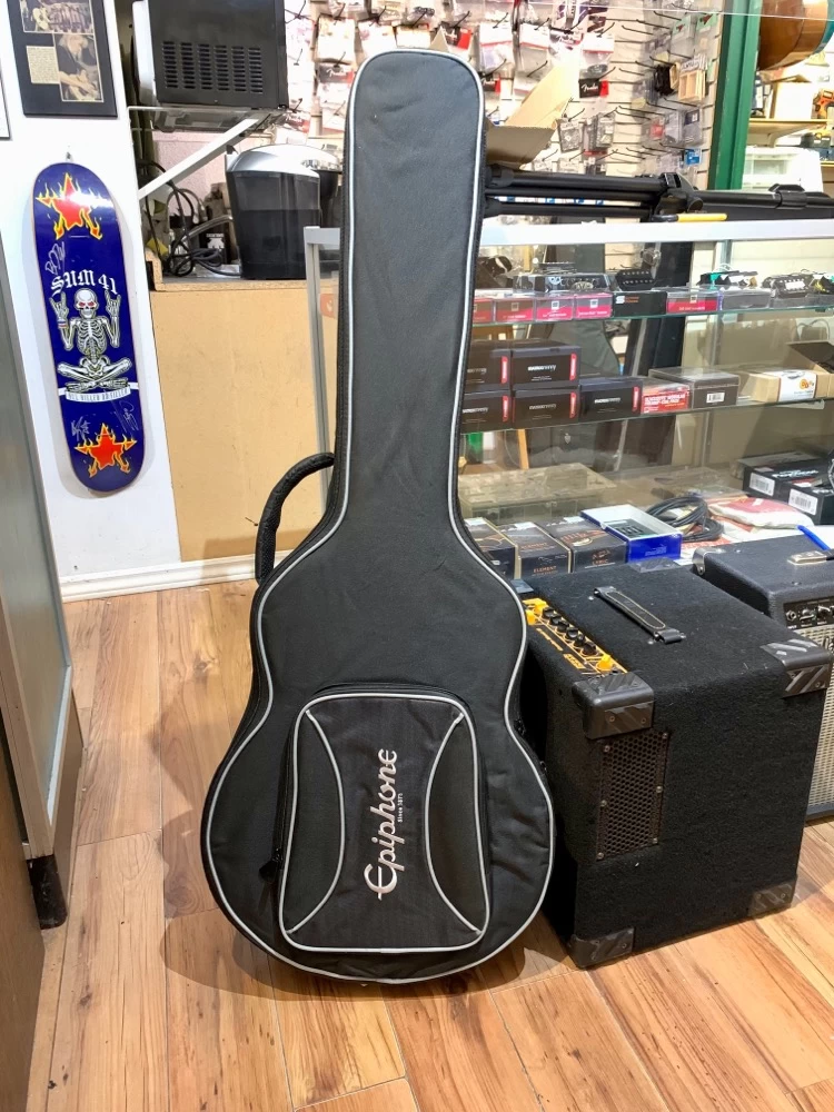 22 medium jumbo frets, mother of pearl block inlays with abalone lightning bolts, Grover Rotomatic tuning machines and a Graph Tech nut. An Epiphone LockTone Tune-O-Matic bridge and Stop Bar tailpiece hold down the other end of the strings and contribute to the impressive sustain of the instrument. The electronics include full-sized Epiphone Alnico Classic PRO humbucker pickups that are paired with CTS potentiometers for smooth control over individual pickup volume and overall tone. Finished in Black Aged Gloss that is paired with lightly aged gold hardware. An EpiLite case is included.