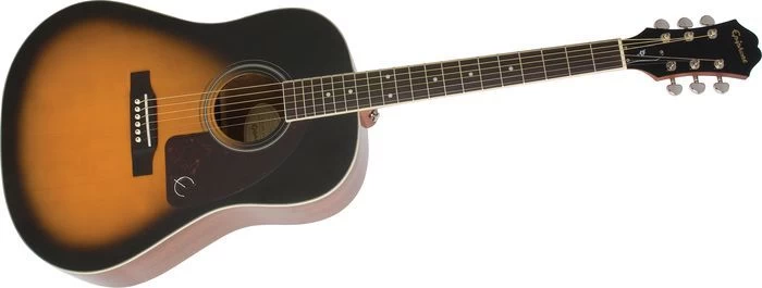 The mahogany back and sides, paired with a solid Sitka spruce top brings out rich harmonics, lots of projection and clarity in tone. A glued-in, dovetail neck joint keeps the Epiphone acoustic guitar’s neck and body stable, without losing any subtleties in tone. The mahogany neck adds strength, as the wood is quite durable and will stand up to the elements. The rosewood bridge and fretboard produces lasting sustain in a deep appearance.