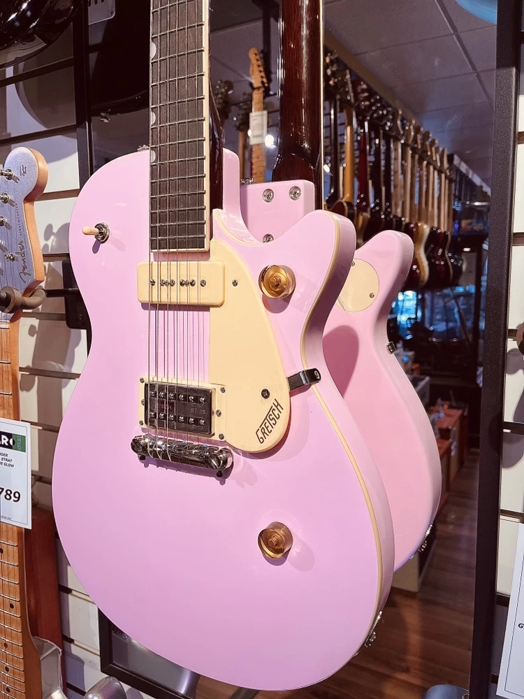 This is no Inverted Jenny, but it could end up as collectible one day. This is supposed to be Shell Pink, but is more like Bubble Gum. Powered by Broad’Tron BT-2S bridge and P90 Soap Bar neck pickups, this Streamliner delivers tight lows with a throaty midrange that is harnessed and shaped by a master tone control, master volume control and three-way pickup switching.