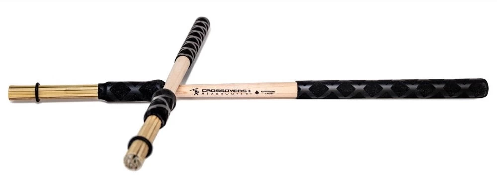Crossovers respond and play very fast, much like a normal stick. The bulb area is a solid bead that can be played on the bell of a cymbal or used to execute rim shots and even cross sticking. Because we have combined rods with a solid wooden shaft, the dynamic range of Crossovers is impressive, especially when intensity and volume of the music increases.