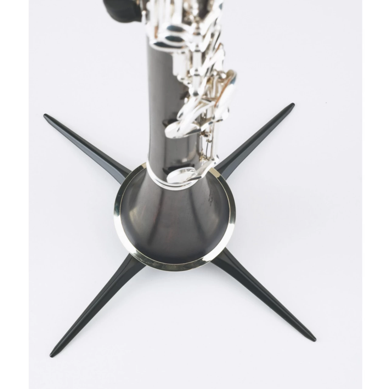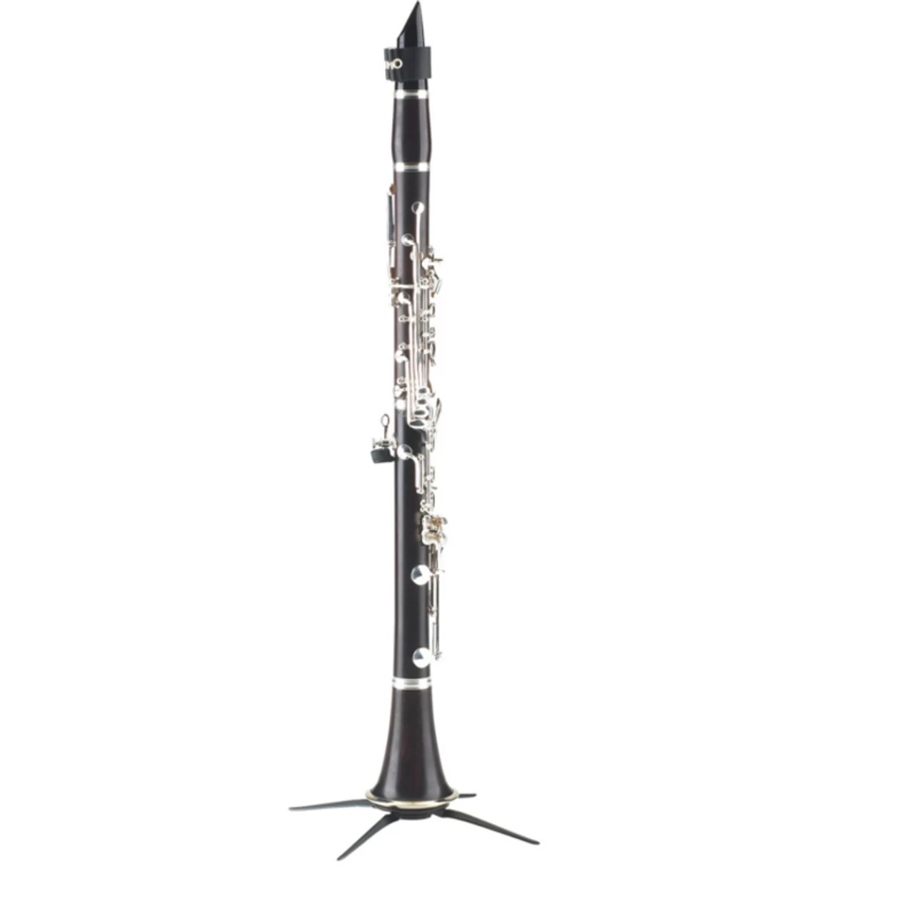 Unique, compact clarinet stand with black plastic peg which fits A and B clarinets. The 4-leg base provides maximum stability for the instrument. The detachable metal leg base screws into the peg so that the entire unit can be stored in the bell of the instrument. Very handy!
