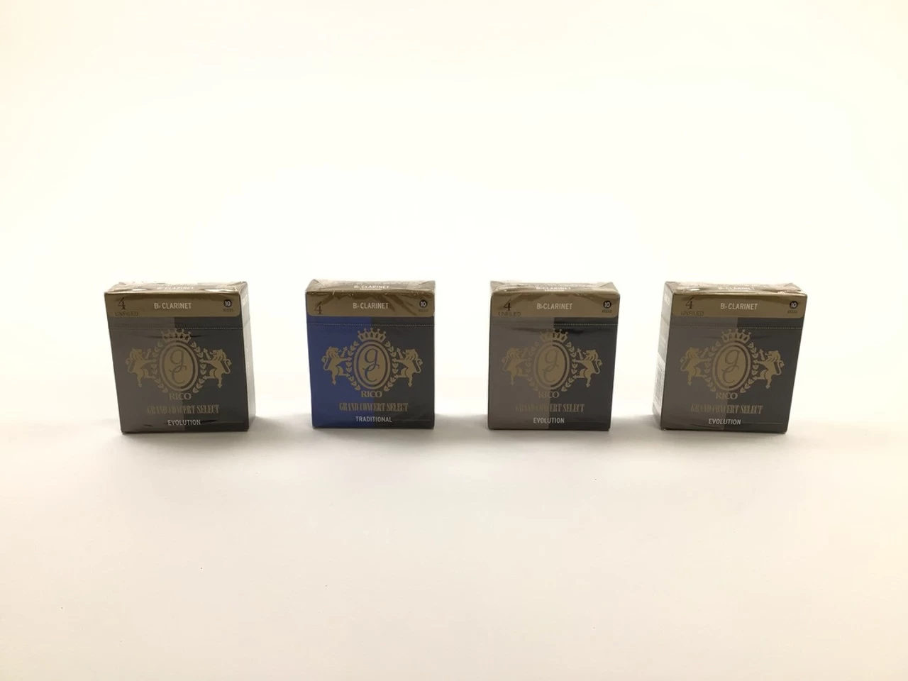 Reed Lot 25. This lot contain three boxes of new Rico Grand Concert Select Evolution Bb clarinet reeds and one box of new Rico Grand Concert Select Traditional Bb clarinet reeds. Each box contains 10, strength 4, reeds. *No Refunds Or Returns on Reed Lots*.