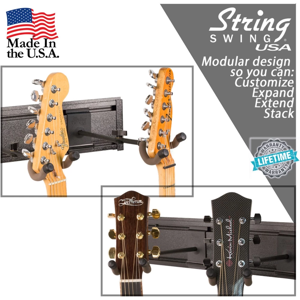 When it comes to hanging your guitar collection, secure support, accessibility, and display are key. Much like all String Swing products, the multiple guitar rack is designed and manufactured with high-quality materials to provide the most reliable and effective storage solution. The aluminum slatwall rail spans multiple studs, giving you confidence your guitars are being securely supported. To top it all off, the racks and hangers are always made in the USA.