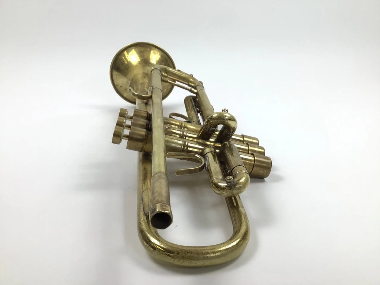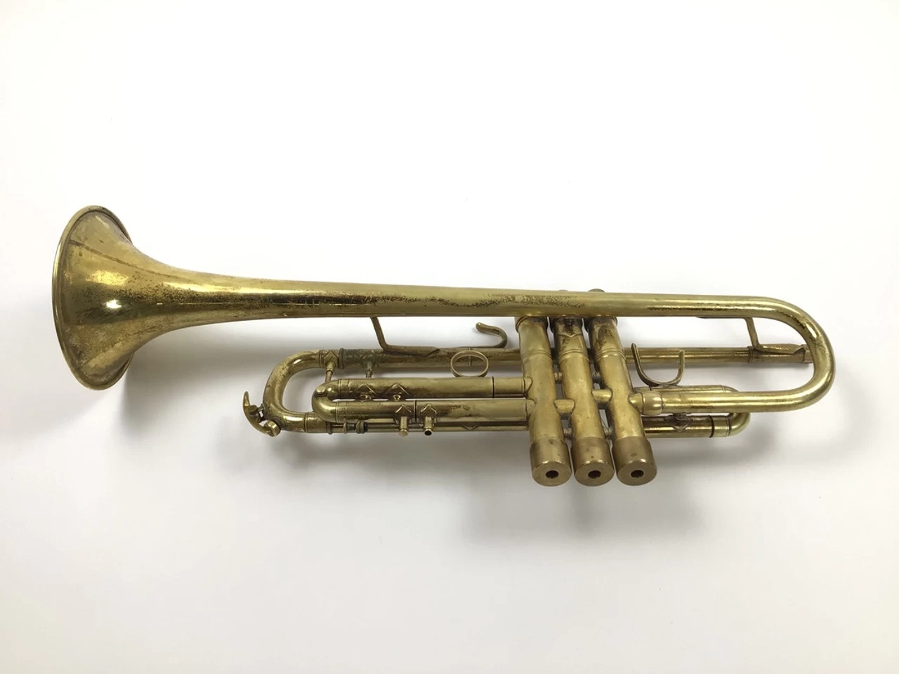 Used Bach Stradivarius Model 37, ML bore (.459″), Bb trumpet in raw brass, manufactured ca. 1980. Instrument is in fair/good condition apart from heavy surface scratching, metal wear/pitting, and evidence of prior bell repair. Intsrument has heavy top and bottom valve caps and finger buttons.