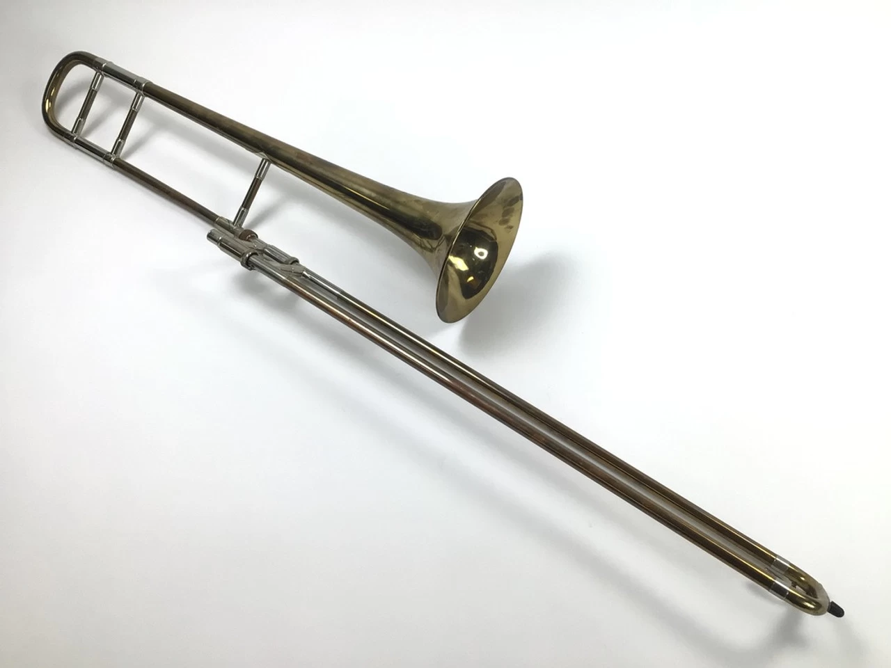 Used Bach New York 6 (IV) Bb tenor trombone in lacquer finish, likely manufactured in Bach’s Bronx workshop. Features include a .485″ bore handslide and 7″ yellow brass bell, IV style taper. Instrument is in good condition for its age apart from surface scratching, lacquer loss throughout much of the instrument (not affecting playability) and a few dings/dents. Includes case.