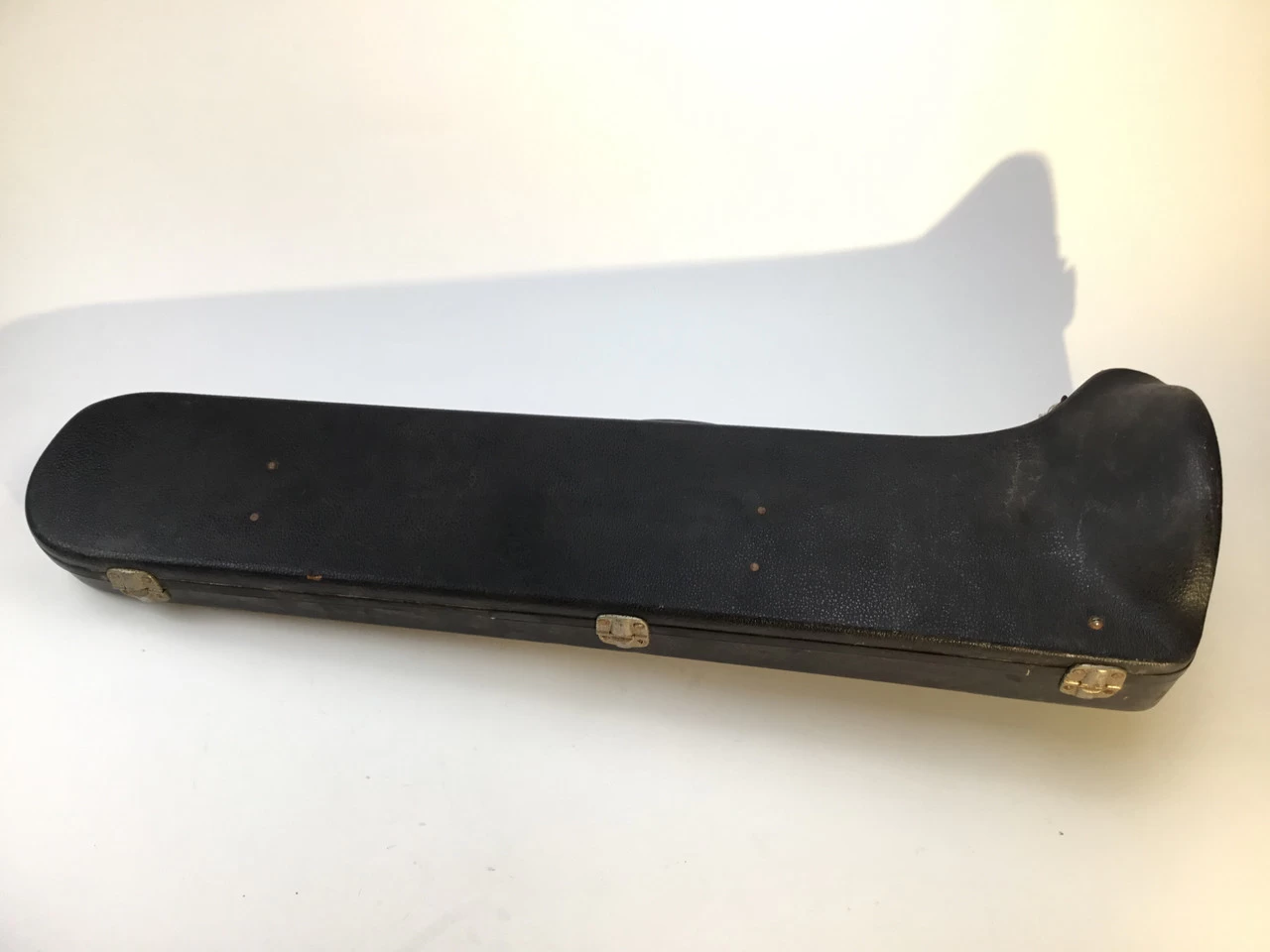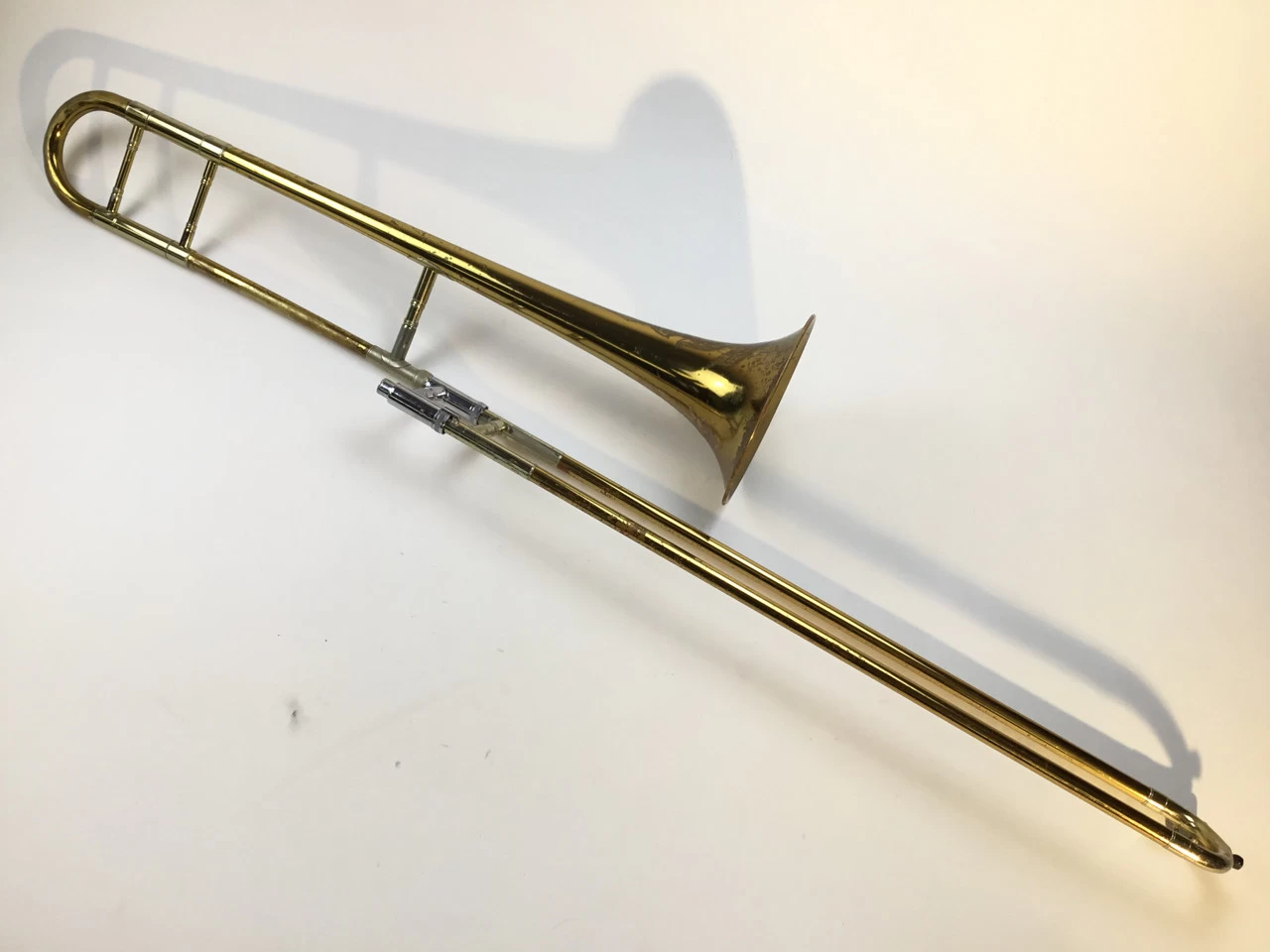 Used 30H Bb Tenor trombone in Lacquer with a 0.494″/.507″ hand slide and 7″ bell flare. Instrument has heavy lacquer wear and scratches throughout slide and bell flare. The trombone shows signs of previous repairs that have been done on the tuning slide. Comes with gig bag.