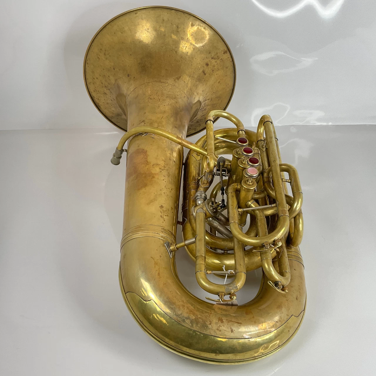 Used Conn CC tuba (SN: 44495849) in raw brass with ProTec gig bag. Custom built tuba has 20″ upright bell, 36.5″ tall and 4 front action MAW pistons of .687″ bore with right thumb operated rotor valve of .770″ bore. 4th valve tubing is larger .734″ bore. Adustable Gap Receiver has the American shank adapter. Great playing tuba with that sweet old time Conn tuba sound. Minor dings, dents and scratches as can be expected of a professionally used tuba.