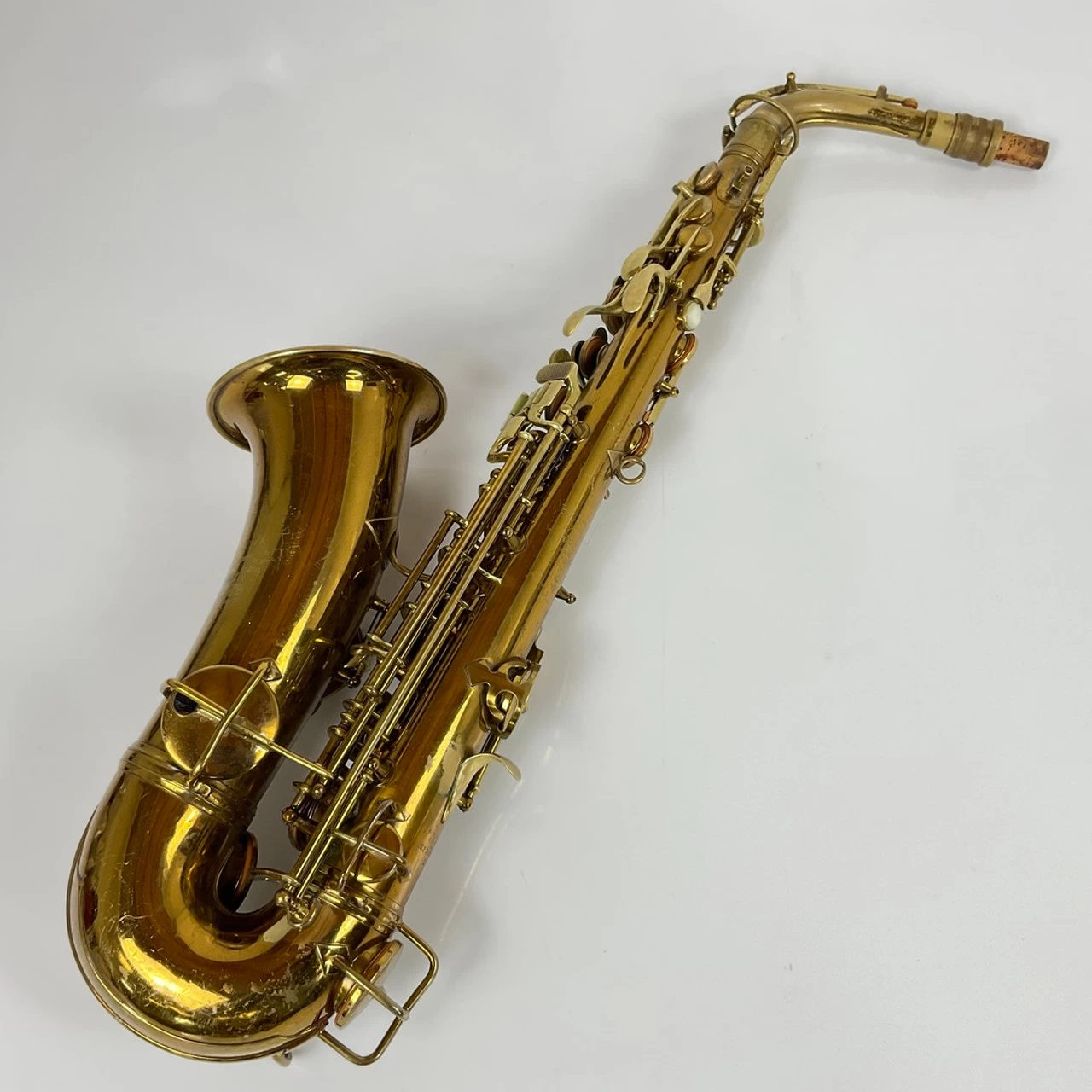 Used Conn Eb Alto Saxophone in lacquer finish, manufactured in Elkhart, Indiana, ca. 1969. Instrument is in good condition apart from surface scratching and lacquer wear. Pads and corks in acceptable, functional condition. Includes case.