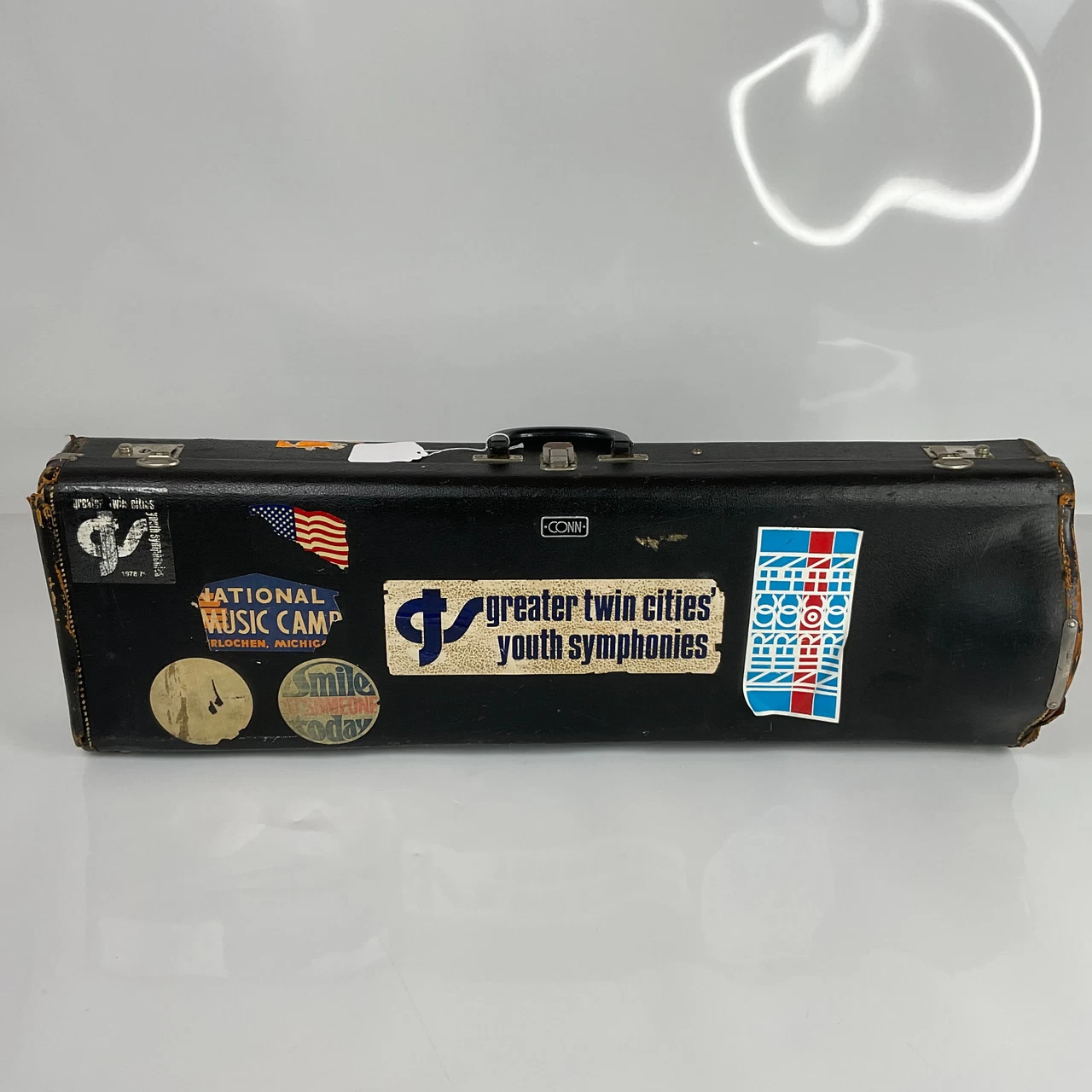 Used Conn 88H Bb tenor trombone in lacquer finish, manufactured in Elkhart, Indiana, ca. 1967. Features include a .547″ rose brass handslide and 8.5″ rose brass bell flare. Instrument is in good condition for its age apart from surface scratching, some lacquer wear, and some minor dings throughout. Includes original case.