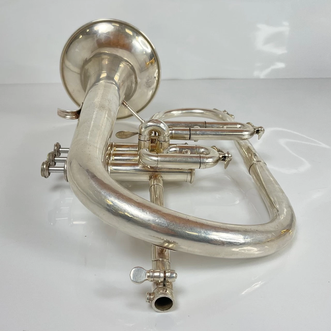 Used Courtois Bb flugelhorn in silver plate. Instrument is in good condition apart from surface scratching, a few minor dings, some dent repair to the bell tail and some minor pitting at contact points. Includes case.
