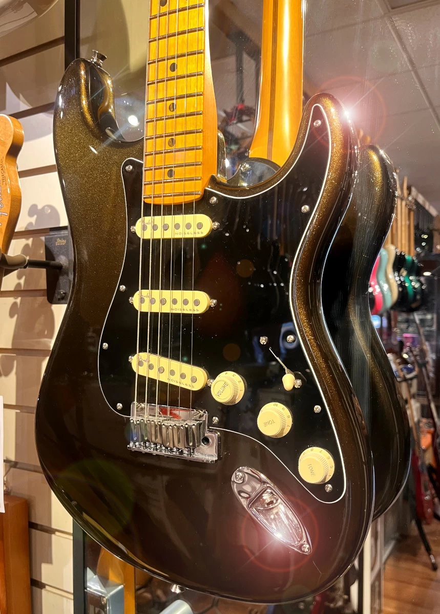 This Fender American Ultra Stratocaster – in Texas Tea Finish – is in stunning condition – it looks virtually unplayed – and sounds and feels every bit as fantastic as you could hope for! The pickguard has been swapped out for a handsome 3 ply black/white/black guard, but the original gold anodized guard comes included, along with the original hardshell case.