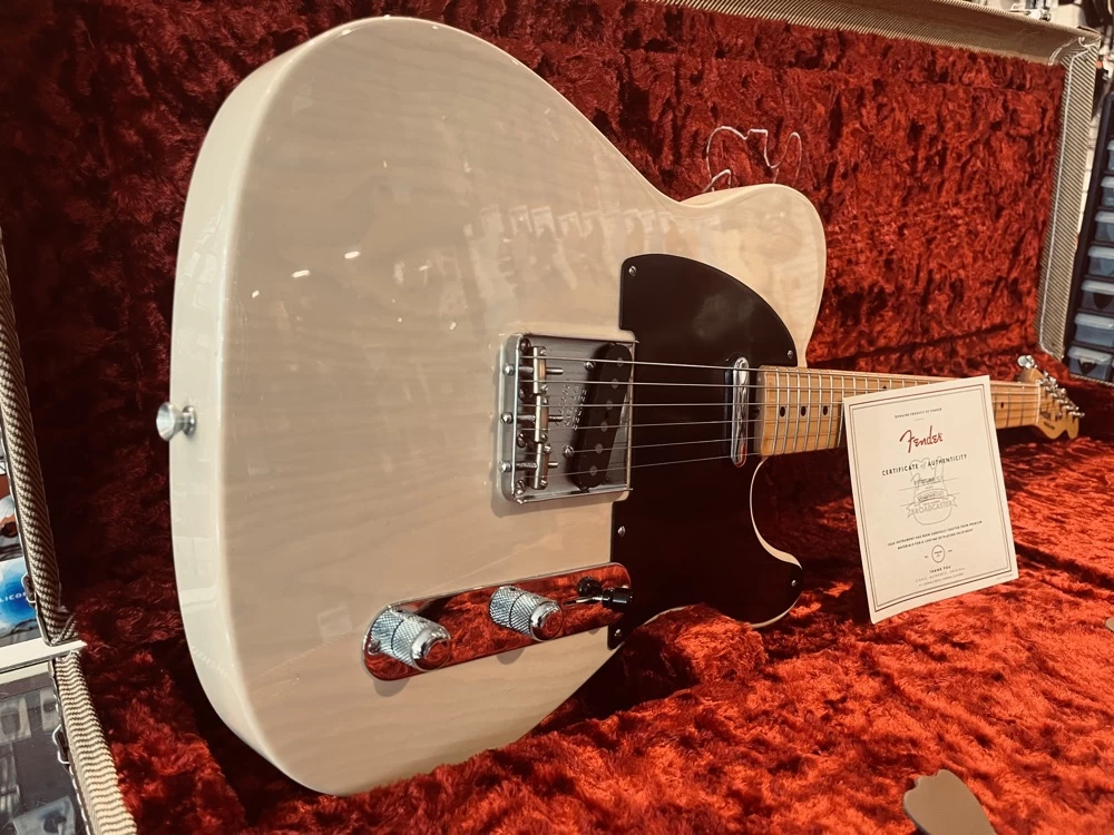 The one-piece rift-sawn maple neck has a 1950 Broadcaster profile, 7.25”-9.5” vintage compound-radius fingerboard and 21 medium vintage frets. Other features include hand-wound ’50-’51 Blackguard pickups with ’51 modded “Nocaster” wiring (similar to the original, with blender pot and slightly brighter rhythm setting in the neck position).