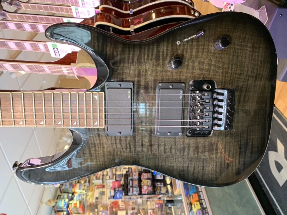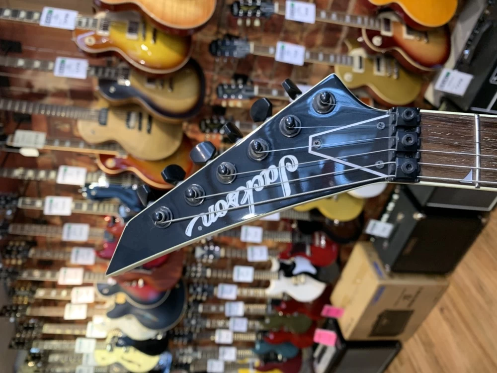 EMG-81 and 85 high-output humbuckers produce scorching tone while the compound-radius rosewood fretboard curves dramatically at the nut for easy chording and flattens out as it approaches the neck joint for wide bends without fretting out. Yank those notes right on up to ecstasy with the recessed-cavity, Floyd Rose-licensed double-locking tremolo system. Includes deluxe Jackson molded case by SKB