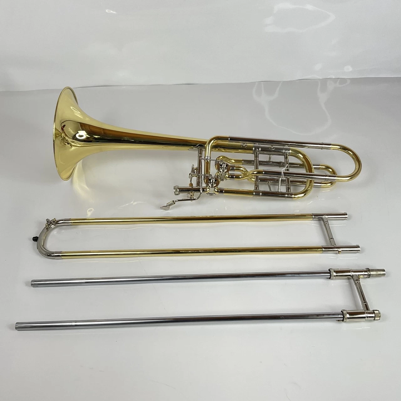 Used Jupiter JSL-1242 Professional Bb/F/D Dependent Bass Trombone in lacquer finish. Features include a .562” bore handslide, dependent rotary valve section, and 9.5” yellow brass bell flare. Instrument is very good condition apart from surface scratching. Includes original case, Eb slide and three leadpipes.