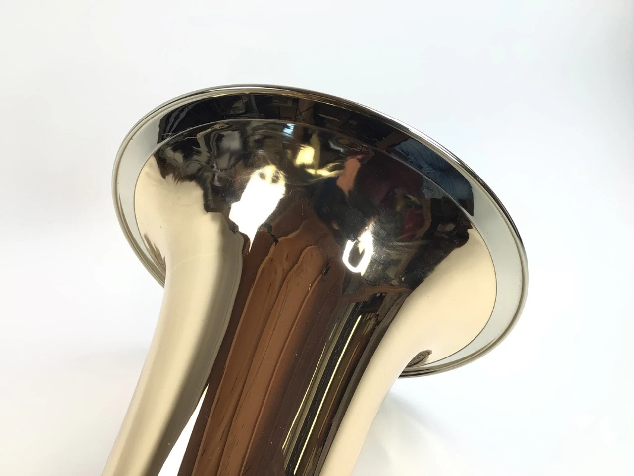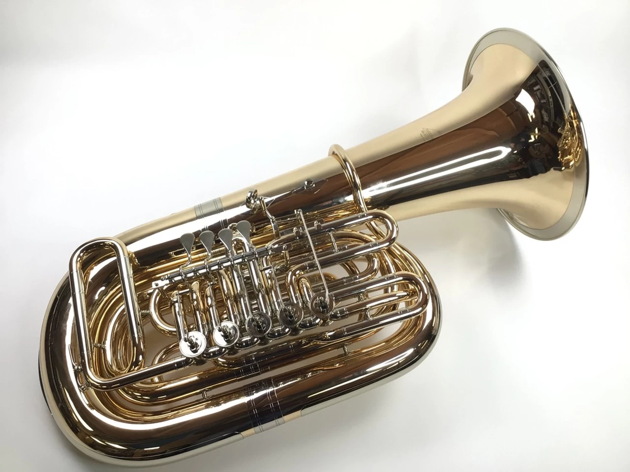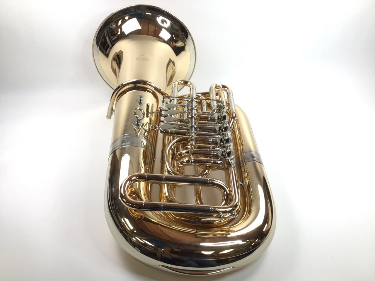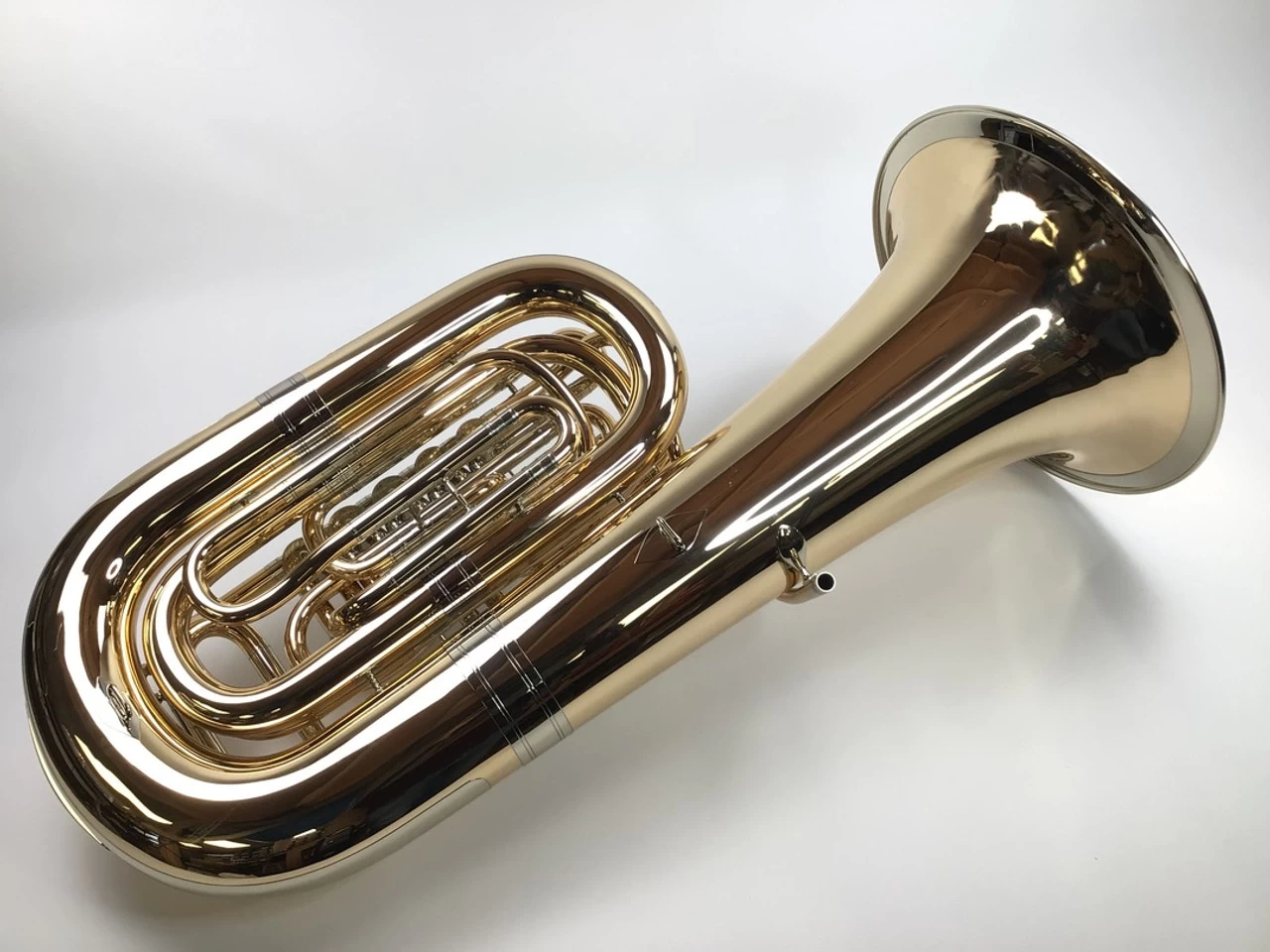 Used Miraphone BB187-5V-GB (SN: 9170150) in lacquer. No case. 17.75″ upright bell and 5 rotor valves of .770″ bore. Takes American shank mouthpiece. Brand new gold brass tuba got a wrinkled bell at a conference and had to be rolled out. You can see where the work was done. An uber 4/4 tuba BBb tuba that is popular in Europe, was special ordered with the longer A=440 main tuning slide for the American market.