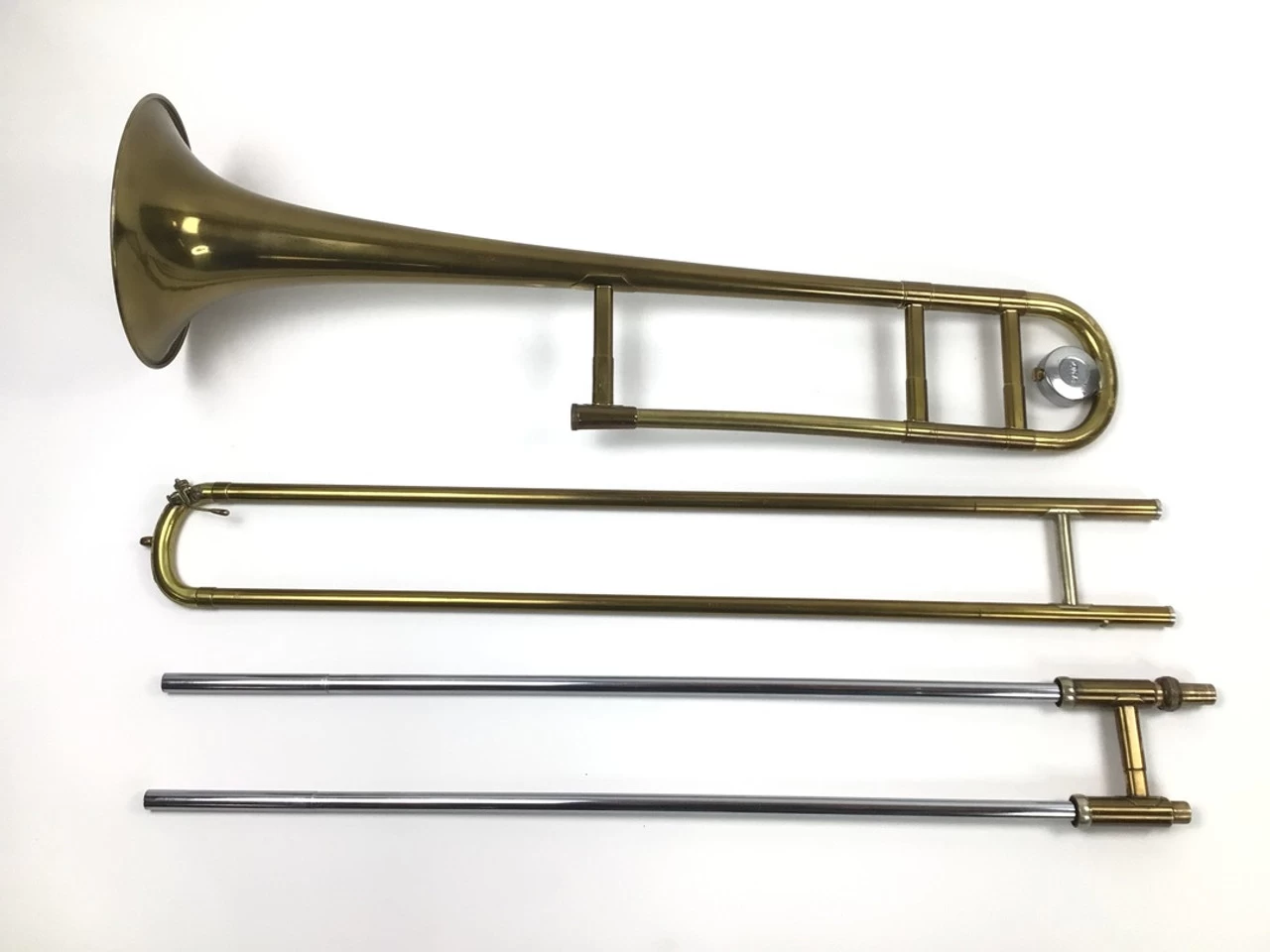 Used Olds Ambassador Bb tenor trombone in lacquer finish, made in Fullerton, CA. Features include a .485″/.500″ dual bore handslide and 7.5″ bell flare. Instrument is in good condition apart from surface scratching and lacquer wear. Includes case.