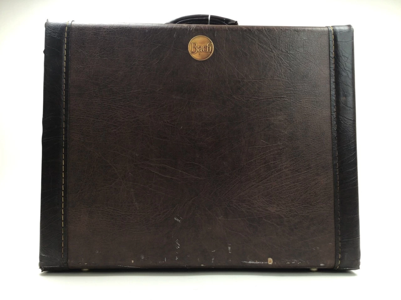 Used Yamaha/Bach Hybrid Bb trumpet. This horn features a Yamaha YTR-6335HS Mark II valve cluster and tuning slide in silver plate, unmarked raw brass leadpipe (assumend Larson Brasswerks), Larson Brasswerks bell to leadpipe bracing, Bach 72 raw brass bell with Larson bell tail adjustment and includes additional raw brass bell with Larson bell tail adjustment (assumend Larson Brasswerks bell). Instrument is in good condition apart from surface scratching and minor wear at contact points. Includes Bach quad trumpet case.